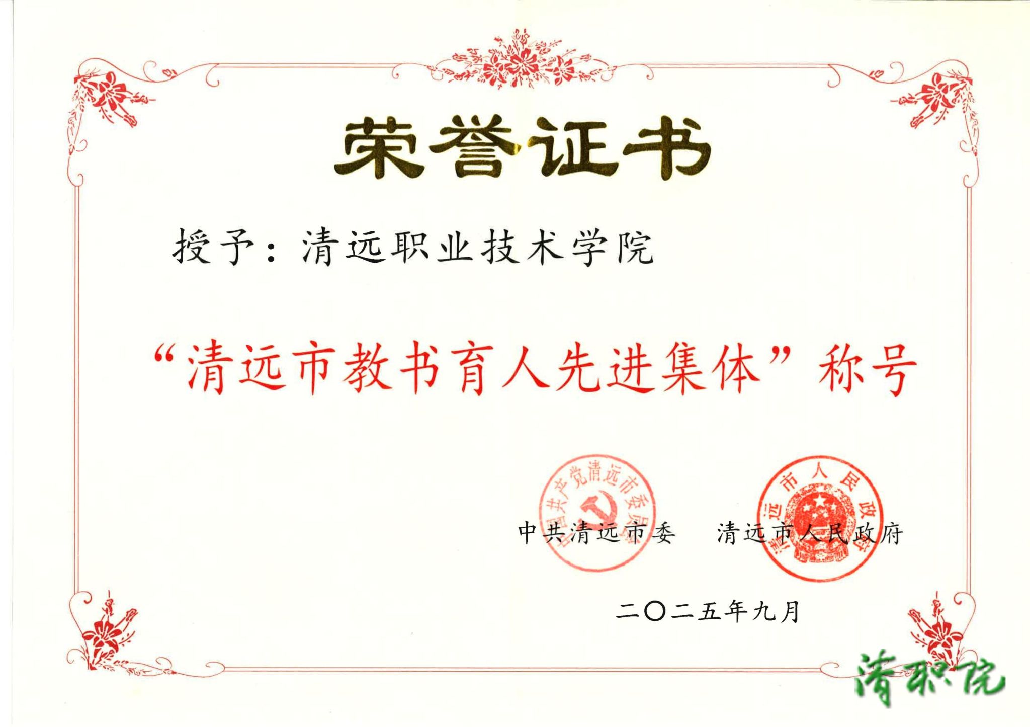 9月10日教师节之际,清远市委、市政府对教育领域杰出集体与个人进行表彰。清远职业技术学院凭借深厚文化底蕴、创新教育理念和显著育人成效,脱颖而出。这一殊荣是对学院过往努力的高度肯定,也是对未来发展的激励与期许。