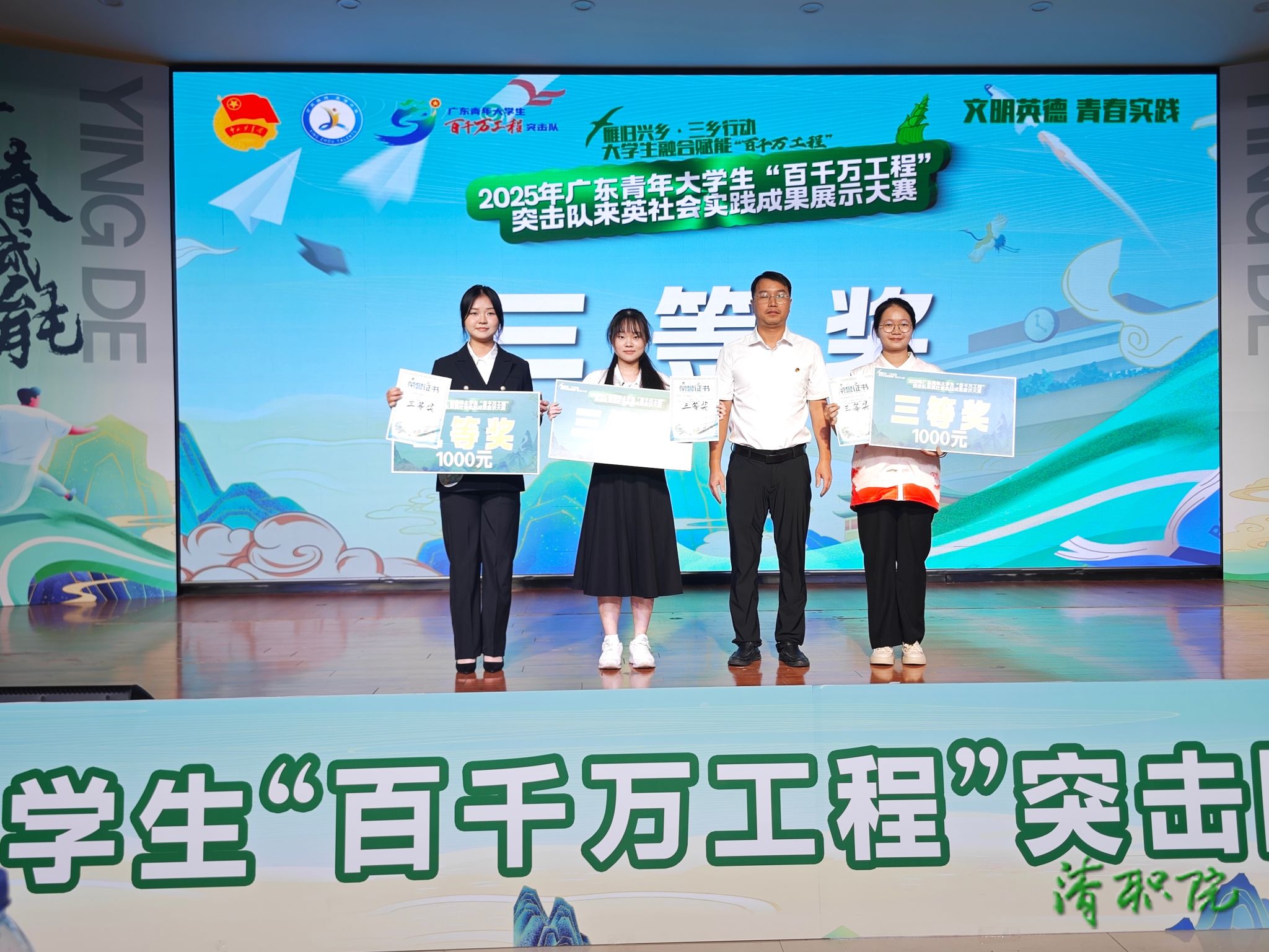 9月14日,在英德市青少年宫1楼演艺厅举办的广东青年大学生“百千万工程”突击队(成员:李雪玲、高远、梁晓莹、李柏、龚俊豪、蔡婵霞、张颖、梁浩芳、胡若钰、王晓悦)来英社会实践成果大赛决赛中,清远职业技术学院数字媒体技术专业“百千万工程”突击队从16支晋级队伍中脱颖而出,荣获三等奖。带队老师代慧婷、陈恒荣、周游同时获评“优秀指导老师”称号。