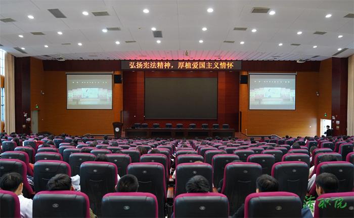 4日上午,在图书馆学术报告厅,480多名师生同上一堂学习宪法的大思政课。9:00时开始,师生现场收看青少年普法网 “宪法晨读”直播节目,并同步跟读宪法部分条款。随后思想政治课理论教学部教师给学生讲课,对宪法的重要性、基本原则和基本内容等进行解读。