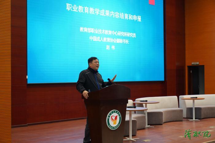 教育部职业技术教育中心研究所研究员、中国成人教育协会副秘书长赵伟以《职业教育教学成果内容培育和申报》为题,从国家发展战略的高度,围绕经济转型升级和粤港澳大湾区的建设等重大战略决策,全方位深入阐释了当前职业教育如何有效融入并更好地服务地方经济社会的发展。并围绕如何针对国家政策大背景和职业教育本质,结合地方和院校实际,培育教学成果作主题发言。