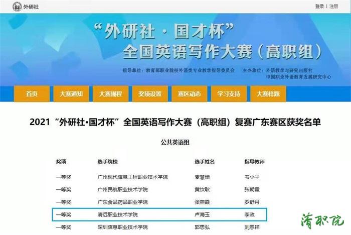 日前,2021“外研社·国才杯”全国英语写作大赛(高职组)广东赛区复赛结果揭晓。清远职业技术学院村(社区)“两委”干部学历提升班2020级(秋)学生卢海玉获(公共英语组)一等奖。该项比赛由教育部职业院校外语类专业教学指导委员会指导,由外语教学与研究出版社、中国职业外语教育发展研究中心联合主办,是全国范围内具有较高影响力和认可度的英语写作比赛。